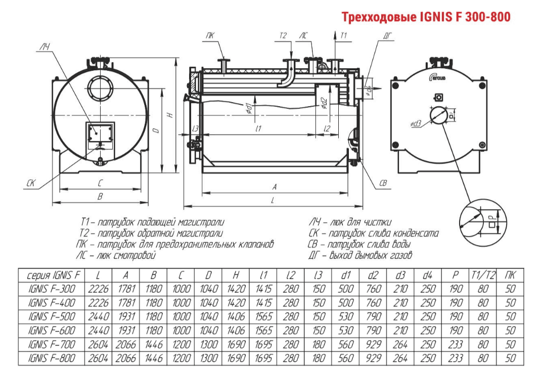 Технические характеристики водогрейного трёхходового котла ARCUS IGNIS F-600